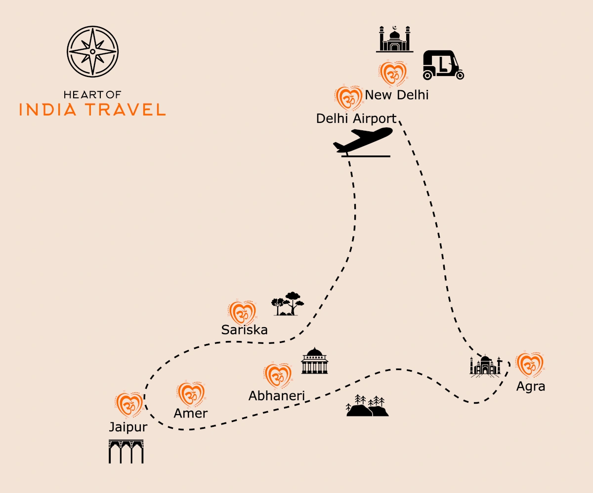Your journey begins with a flight from your home airport to Delhi, the vibrant capital of India.