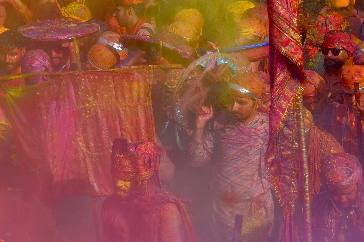 Today, Latmar Holi takes place in Nandgaon, where the women from Nandgaon are now playfully hitting the men from Barsana with sticks.
